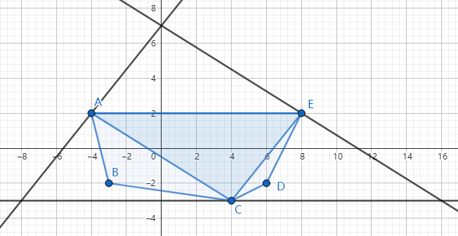另外补充一点性质:所求三角形的反互补三角形一定包含了凸包上的所有点(可以在边界)。通俗的说,构成的三角形是这个反互补三角形的中点三角形。如下图所示,点 \(A\) 不在 \(\triangle BCE\) 的反互补三角形内部,故 \(\triangle BCE\) 不是最大三角形;\(\triangle ACE\) 才是。